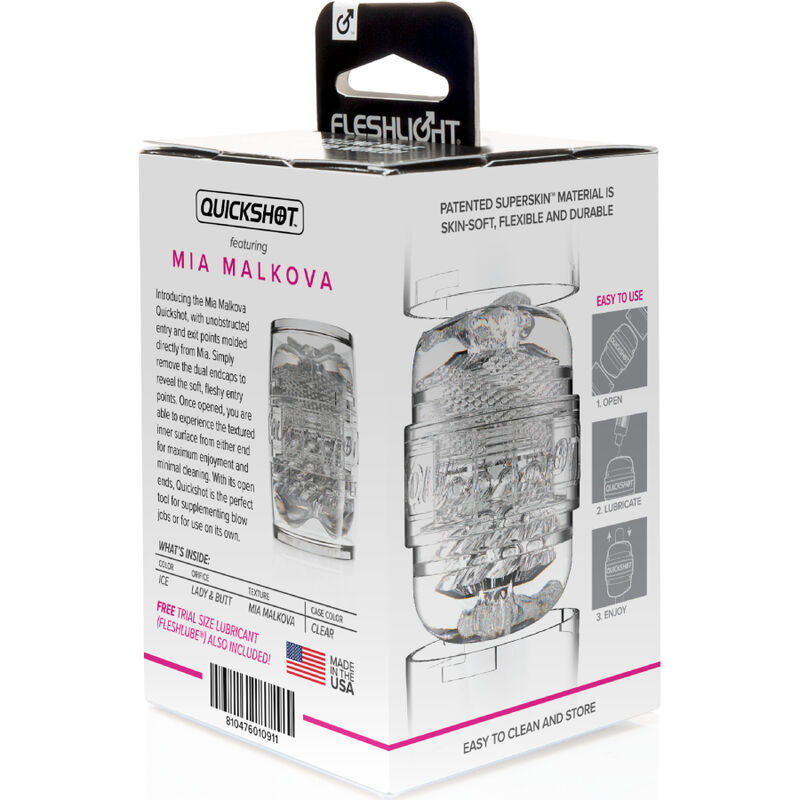 Mia Malkova Quickshot presenta punti di uscita non ostruiti modellati sulla vagina e sul sedere di Mia. Quickshot di Mia Malkova può essere utilizzato come stimolazione aggiuntiva durante il gioco orale di coppia o per la masturbazione.