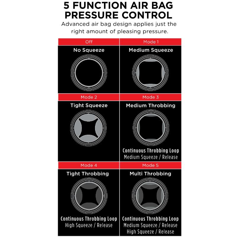 • Controllo della pressione dellairbag a 5 funzioni: il design avanzato dellairbag applica la giusta quantità di pressione piacevole. Premere per attivare e tenere premuto per 3 secondi per rilasciare.
